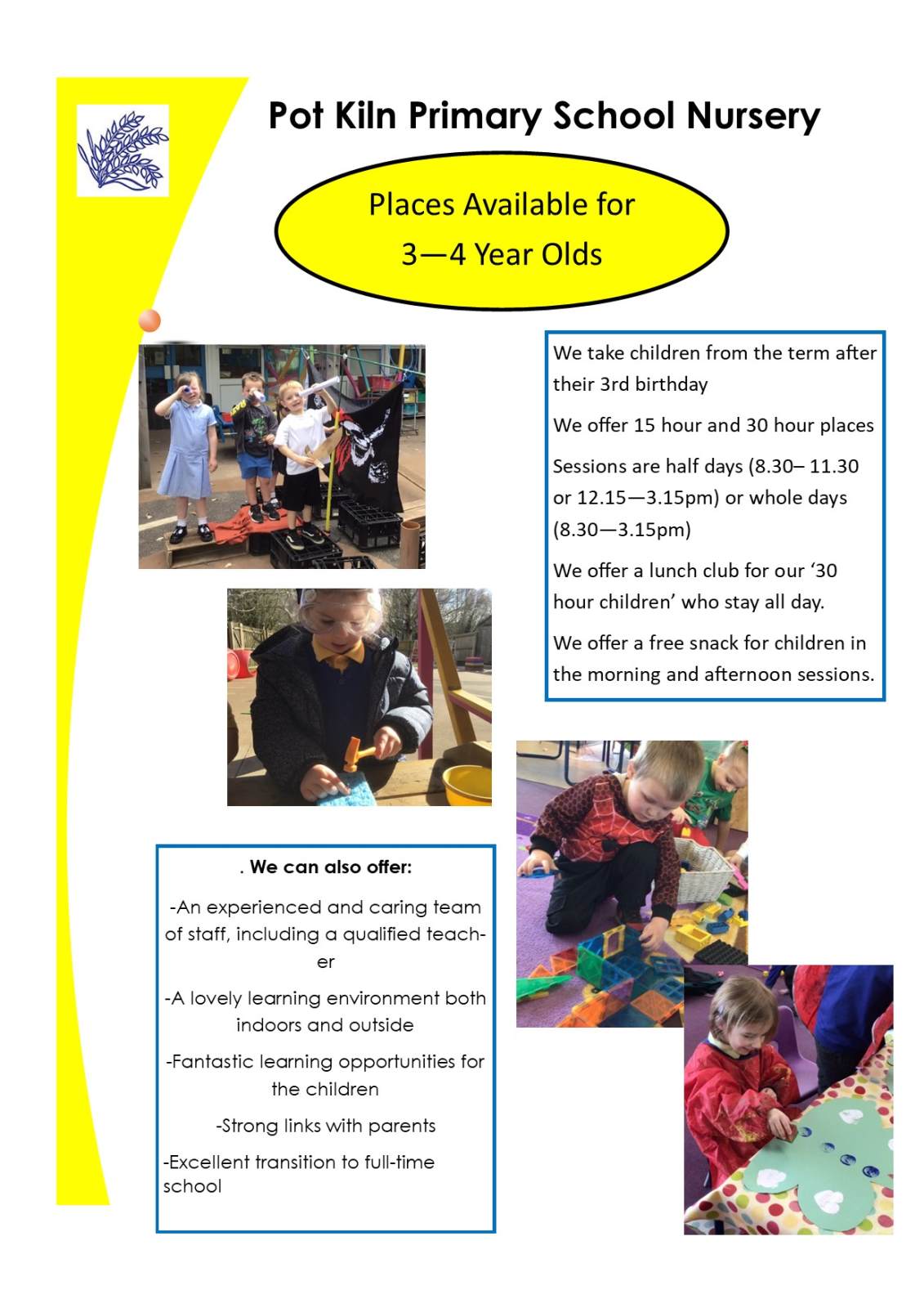 At Pot Kiln Primary School we are privileged to have a Nursery attached to our school. The Nursery is led by a qualified teacher and an experienced Nursery Nurse. We provide a stimulating indoor and outdoor environment with enriching learning activities to provide the best start in their educational journey. The children who attend our Nursery quickly become part of our whole school community and get to take part in whole school events such as our Nativity, Kiln Fest and Sports Day. The children's learning and development is carefully planned for so that they progress well through the Early Years Foundation Stage Curriculum and make a smooth transition into Reception.