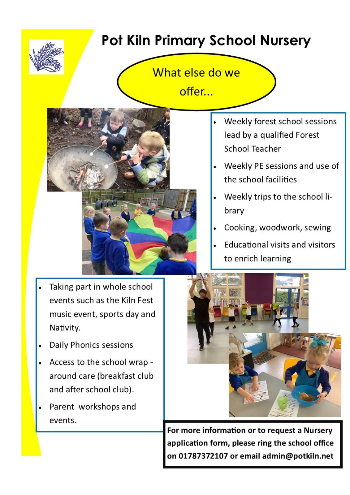 At Pot Kiln Primary School we are privileged to have a Nursery attached to our school. The Nursery is led by a qualified teacher and an experienced Nursery Nurse. We provide a stimulating indoor and outdoor environment with enriching learning activities to provide the best start in their educational journey. The children who attend our Nursery quickly become part of our whole school community and get to take part in whole school events such as our Nativity, Kiln Fest and Sports Day. The children's learning and development is carefully planned for so that they progress well through the Early Years Foundation Stage Curriculum and make a smooth transition into Reception.